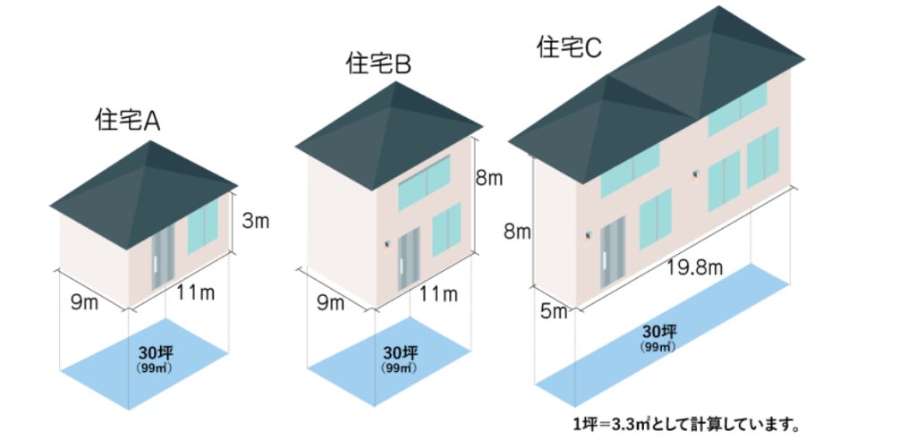 このとおり、延床面積・坪数と外壁の面積は異なるものだということをよく覚えておきましょう。